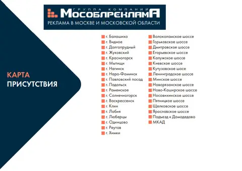 Группа Компаний "Мособлреклама" является владельцем сети собственных рекламных конструкций в Москве, Подмосковье и на МКАД, которая позволяет проводить кампании с охватом большей части аудитории Москвы и Московской области.